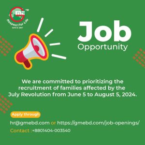 Global Medical Engineering (BD) Ltd. will prioritize the recruitment of families affected by the July Revolution from 5 June to 5 August, 2024. If you or someone you know has been impacted, we encourage you to apply. We are committed to providing our support.