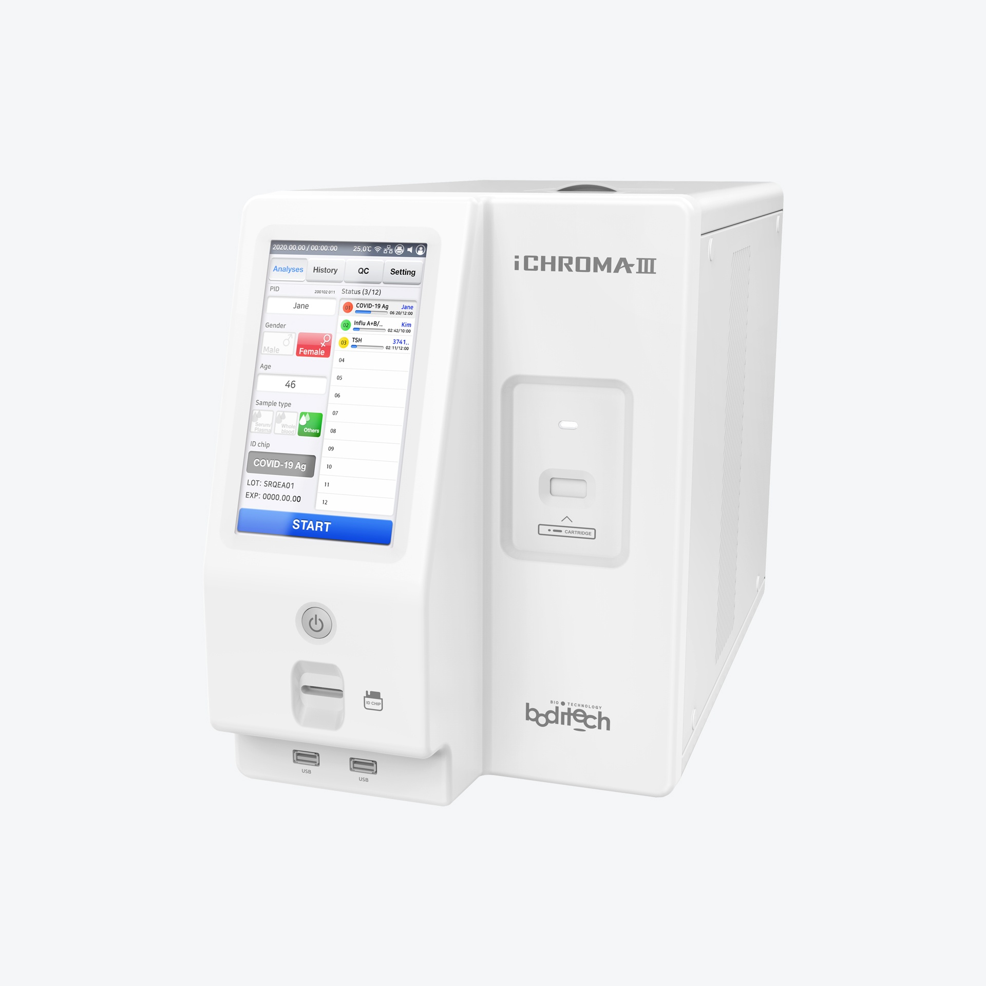 ichroma™ III accepts cartridges for various biomarkers in random sequence and processes them in a preset temperature, even combines test parameters with differing incubation period. The user will prepare each cartridge before inserting it to the system, one at a time.